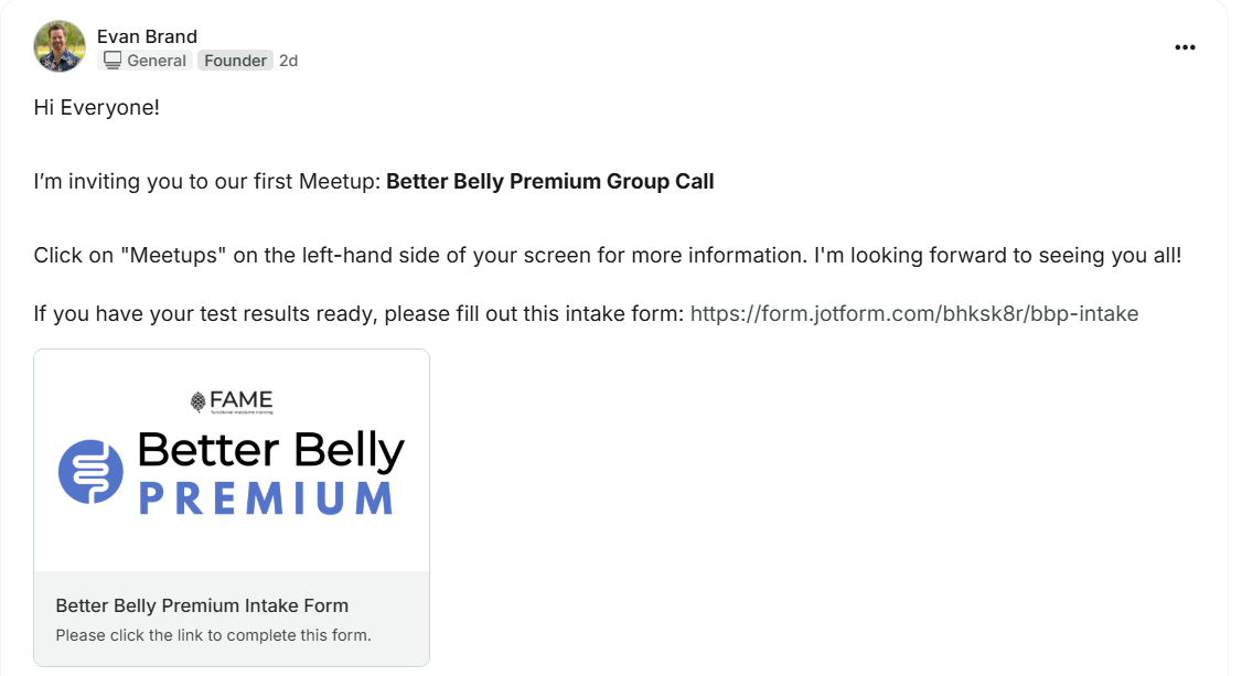 You'll find the details and link to join the call in the Community Page. To access the community page, log into your student account and head to your library where you will see "FAME Community - Better Belly Premium".